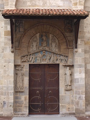 Portail sud 入り口は、4番目のベイにあります。これは12世紀末に造られ、リンテルと、オーヴェルニュでは珍しく彫刻が施されたタンパンで装飾されています。18世紀に新たに彩色されました。フランス革命時に入り口は損傷を受けましたが、今日修復されています。 Le portail est ouvert dans la quatrième travée. Datant de la fin du 12e siècle, il est orné d'un tympan qui est rarement sculpté en Auvergne, ainsi que d'un linteau. Ils ont été repeints au 18e siècle. Endommagé par les révolutionnaires, ce portail est aujourd'hui restauré. |
