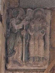 Dans les angles au-dessus du tympan, deux bas-reliefs se trouvent : l'Annonciation (à gauche) et la Nativité. |