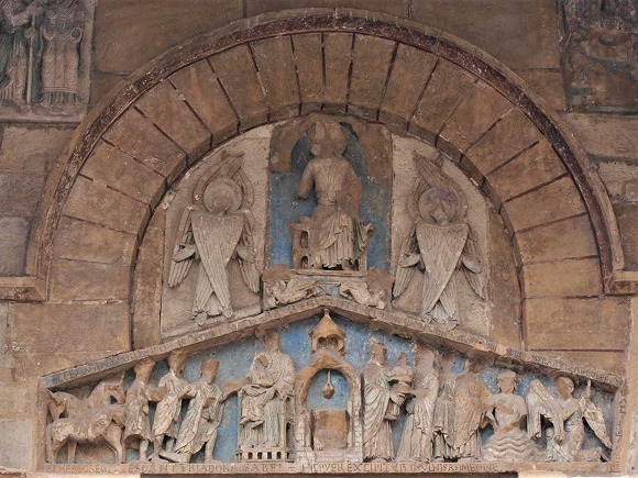 山型のリンテルには、キリストの生涯の3つのシーンが展開されます。左から、マギの礼拝、イエス・キリストの神殿奉献、ヨルダン川でのキリストの洗礼です。 |