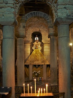 La Vierge Noire クリプト中央に、黒い聖母が祀られています。 黒い聖母のオリジナルの像は、10世紀に制作されました。コンクのサント・フォワ修道院長、次にクレルモン司教を務め、教会参事会を創設したエティエンヌ2世が、金銀細工師 Alleaumeに制作を依頼しました。コンクの黄金のサント・フォワ像をモデルにしていると思われます。 この栄光のマリア像は、ロマネスク期の黒い聖母の原型と考えられています。僅か高さ28センチのこの彫像への信奉は、初めは地元で限定的なものでした。 しかし17世紀、黒い聖母によるとされる大きな2つの奇跡が起こります。マリア像は1614年に農作物の収穫に被害を与える長雨を止ませ、1631年にはペストの流行を止めました。この時から毎年のマリア像の巡礼行列が始まり、マリア像は有名になりました。 マリア像は損傷が激しかったため、1734年に作り直されました。これが今日クリプトで見られる彫像です。オリジナルのマリア像は、フランス革命時に破壊されました。 17世紀以来、奇跡のマリア像のカテドラルまでの巡礼行列が、毎年5月15日に続く日曜日に行われます。 |