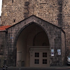 | 15世紀に起こった地震で、ポーチは崩壊しました。現在のポーチは16世紀にヴォルヴィックの黒い石で建てられました。 Les séismes du 15e siècle ont détruit l'ancien porche. Au 16e siècle, le porche actuel a été construit en pierre noire de Volvic. |
