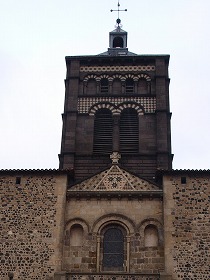 | Le clocher carré réalisé entre 1823 et 1827 en style néo-roman en pierre noire de Volvic, a remplacé celui roman abbatu à la Récolution. Il est composé de deux étages, et décoré des arcatures aux claveaux blanc et noir, et d'un damier de mêmes couleurs. |