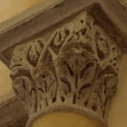 柱頭彫刻がある2本一組の円柱に支えられた、モサラベ・スタイルの三葉の連続アーチが見えます。 On trouve trois arcatures trilobées en style mozarabe, supportées par les colonnes jumelées à chapiteaux sculptés. |