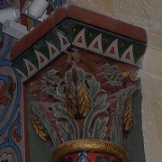 Croisillon sud トランセプトの壁は、開口部の2層で構成されます。下層の開口部は聖人伝の柱頭彫刻がある円柱で分けられ,、格子柄で装飾されています。上層の開口部は黒と白の中石のアーケードで装飾されています。この2色の中石は、モサラベ装飾技術の特徴です。 その上には、三角形と2色のモザイクで装飾されたペディメントがあります。 Le mur du transept est constitué de deux étages de baies. Les baies inférieures sont séparées par une colonne à chapiteau historié, et décorées des damiers polychromes, et celles supérieures ornés des arcades aux claveaux noirs et blancs. Ces claveaux bicolorés sont caractéristiques de la technique mozarabe. Au-dessus des baies, on voit un fronton décoré de triangles et de mosaïques polychromes. |