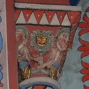 | 大天使ガブリエルによるマリアへの受胎告知と、マリアのエリザベト訪問、大天使ガブリエルによるザカリアへの預言者ヨハネ誕生の告知は、オーソドックスな表現です。マリアの夫ヨハネは、懐妊したマリアを送り返そうかと考え込んでいる様子ですが、天使が彼の顎髭を引っ張っています。 | ||