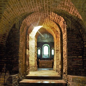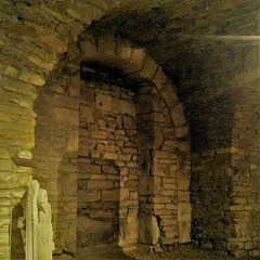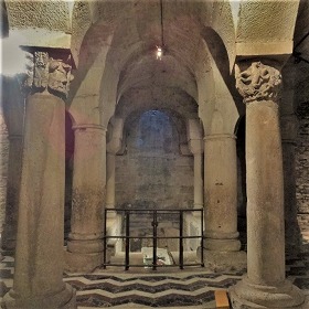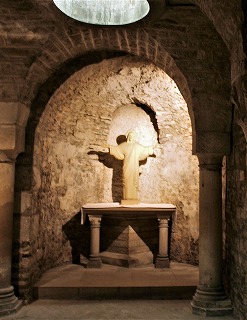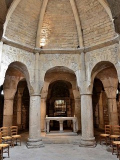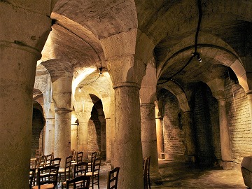 Absidioles クリプトの西側部分は、下層の教会堂のトランセプトの一部にあたります。近年の発掘調査で、身廊の下にいまだ埋もれたままのスペースがあることが証明されています。 セミ・ドームで覆われた4つの後陣祭室には、祭壇と柱頭がある円柱が残ります。 La partie occidentale de la crypte appartenait au transept de l'église basse. Les fouilles recentes ont attesté l'existence de l'espace encore comblé sous la nef. Quatre absidioles en cul-de-four conservent des autels et des colonnes à chapiteaux. |