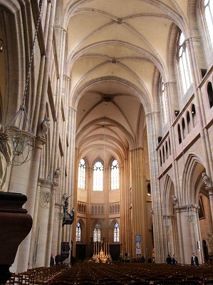 | Elévation ブルゴーニュ・ゴシック・スタイルの身廊は、3層で構成されます。 尖頭型の大アーケードの上に、4つ一組の開口部があるトリフォリウムがあります。更にその上にある開かれた4つのランセットがある高窓が、内部に光を齎します。 L'élévation de la nef dans le style gothique bourguignon, est à trois niveaux. Les grandes arcades en arc brisé, sont surmontées du triforium à quatre baies. Au-dessus, des fenêtres hautes à quatre lancettes, éclairent l'intérieur. Choeur 内陣は、ヴォールトまで続く巨大な円柱が特徴的です。その縦構造はやはり3層で、トリフォリウムを挟んで、ランセットとバラ窓で構成された尖頭型の窓の層が2つあります。 内陣の両脇には後陣祭室があります。 Le choeur se caractérise par de grandes colonnes d'un seul tenant jusqu'à la voûte. Son élévation est également à trois niveaux : le triforium s'intercale entre deux niveaux de fenêtres en arc brisé à lancettes et roses. Il est flanqué de deux absidioles. |