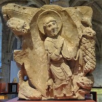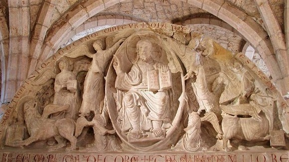 | 「栄光のキリスト」をあらわしたタンパンは、修道院の回廊を飾っていました。 天使らに支えられたマンドルラに坐す栄光のキリストは、右手で祝福のポーズをし、左手に本をもっています。キリストのまわりに四福音記者のシンボルが見えます。 |