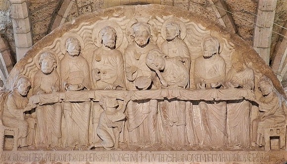 | 「最後の晩餐」をあらわしたタンパンは、修道院の食堂の入り口にありました。 中央のキリストは、左手でパンを持ち、右手で祝福のポーズをしています。キリストは10人の使徒に囲まれています。 キリストの左側で、右手で頭を支えながらキリストの方に身体を傾けている人物はサン・ジャン(ヨハネ)で、居眠りをしているようです。キリストの右側には、天国の鍵(今日消失)を手にしたサン・ピエールの姿があります。ユダはテーブルの前で跪いていて、キリストに魚を差し出しています。 |