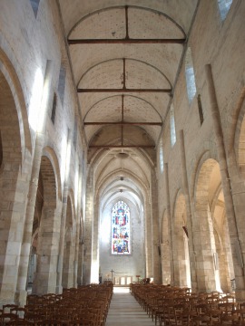 | Plan de l'église 現在の教会堂はラテン十字プランで、5ベイの身廊、側廊、トランセプト、2ベイの内陣で構成されます。内陣の両脇にも側廊があります。中央身廊は円筒型のヴォールトで覆われていますが、その他の部分はオジーヴ・ヴォールトが架けられています。 De plan en croix latine, l'église actuelle est constitue d'une nef de cinq travées à deux bas-côtés, d'un transept saillant, et d'un choeur de deux travées à collatéraux. La nef centrale est couverte de la voûte en berceau, alors que d'autres sont voûtés d'ogives. Nef 中央身廊は半円型のヴォールトで覆われています。身廊の縦構造は2層で、半円型の大アーケードで南北両側廊と隔てられていて、その上に開口部があります。 15世紀、ロマネスク期の2つの円柱を伴うピラーは、柱頭のない八角柱のピラーに造り替えられました。中央身廊側に円柱がひとつ備わっています。 Voûtée en berceau, la nef centrale de deux niveaux, est séparée des bas-côtés par les grandes arcades en plein cintre, surmontées des baies. Au 15e siècle, les piliers romans, flanqués de deux colonnes, ont été remplacés par les piliers octogonaux sans chapiteaux à une colonne engagée du côté de la nef centrale. |
