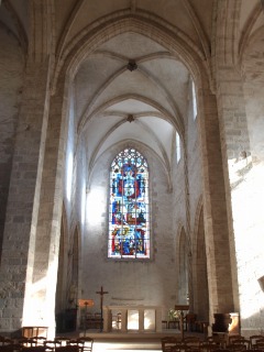 | Transept et choeur 15世紀、トランセプトと内陣はゴシック・フランボワイヤン・スタイルで再建され、それぞれオジーヴ・ヴォールトが架けられました。翼廊と内陣は四分ヴォールトで、トランセプト交差部は六分ヴォールトになっており、中央にオクルスがあります。 Au 15e siècle, le transept et le choeur ont été reconstruits dans le style gothique flamboyant, couvrant de la voûte d'ogives quadripartites pour les croiisillons et le choeur, et sexpartites avec un oculus central pour la croisée du transept. 2ベイの内陣には大きな開口部が設けられていて、両脇には側廊があります。 Percé d'une grande baie, le choeur de deux travées est flanqué de deux collatéraux. |