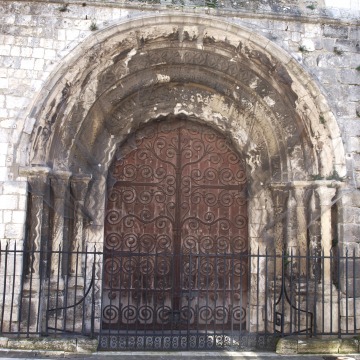 Portail occidental ロマネスクの西入り口は12世紀に造られました。1842年頃に修復されています。 Le portail occidental roman date du 12e siècle. Il est restauré vers 1842. 半円型の入り口は、柱頭彫刻がある小円柱に支えられたヴシュールに囲まれます。小円柱にも彫刻装飾が施されています。 ヴシュール2層目には、最後の審判の場面が描かれます。中央の魂の計量をするための天秤の脇に、右側にはテーブルについている選ばれし者達が、左側にはモンスターに踏まれる地獄に堕ちた者達が刻まれています。 ここで注目されるのは、人物達のイレギュラーな配置です。それというのも、中世において、最後の審判の場面は聖書に倣い、選ばれし者達は左側に、地獄に堕ちた者達は右側に描かれるのが通常であったからです。この配置の逆転は、中央にキリストや大天使といった天秤を持つ人物の姿がないことに起因すると考えられています。 Le portail en plein cintre est orné de voussures sculptées, soutenues par des colonnettes décorées avec chapiteaux sculptés. La deuxième voussure montre le Jugement dernier : de part et d'autre de la balance pour péser des âmes au centre, sont représentés à droite, des élus assis à une table, et à gauche, des damnés, piétinés par des monstres. On remarque ici, la disposition irrégulière des figures : au Moyen Age, dans la scène du Jugement dernier, les élus ont été généralement illustrés selon l'Ecriture sainte, à gauche, et les damnés à droite. Ce renversement serait probablement dû à l'absence d'une figure centrale tenant la balance, le Christ ou un archange. |