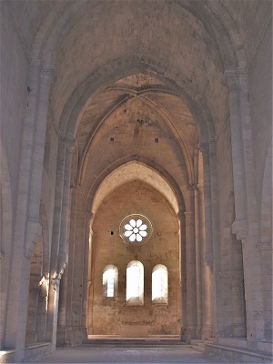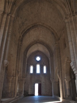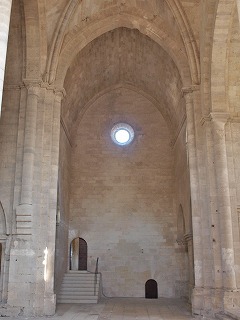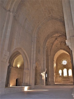 | 修道院の美は、シンプルなフォルム、祈りを捧げる修道士達の気を逸らさないように極力抑えられた装飾、切石が完璧なまでに石積みされていることにあります。また、薄暗い教会堂の中で、Jeux de lumièreと呼ばれる、限られた開口部から射す陽の光が生み出す明暗のコントラストも、シトーの教会堂の魅力のひとつです。 La beauté de l'abbaye de Silvacane resulte de la pureté des formes, de la sobrieté du décor afin de ne pas détourner les moines de la prière, de la perfection de l'appareillage des pierres de taille, et des jeux de lumière au travers des rares ouvertures dans la pénombre. |