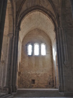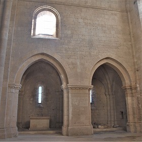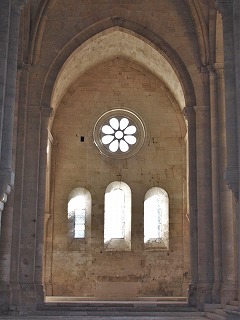 | 身廊より天井が1メートル高いトランセプトは、尖頭型のヴォールトで覆われ、北翼廊にはオクルスが、南翼廊には3つの開口部からなるトリプレが見えます。 北翼廊にある小さな扉は聖具室へと続き、階段は夜の聖務日課のために、修道士達の共同寝室へと直接続いています。数段高いところにある南翼廊に設置された扉は、小塔の階段に繋がります。 |