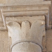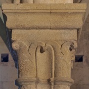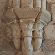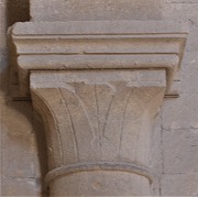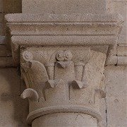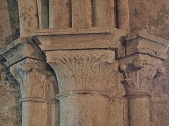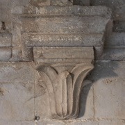 | Les chapiteaux dans l'église sont sculptés de feuilles d'eau, inspirées des feuilles de lotus, motif typique de l'architecture cistercienne. |