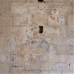 | 内陣には、オリジナルの祭壇のテーブルが残ります。壁に穿たれた壁龕は、聖器や聖水桶等を置くために設置されたものです。 北壁には、修道士達に囲まれている玉座についた聖母マリアを描いた、14世紀に遡る壁画の一部が見えます。またフレスコ画の右側には、ゴシック後期の天蓋付き壁龕の底と天蓋部分が残ります。 |
