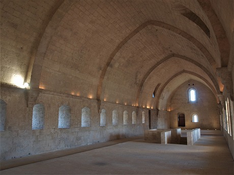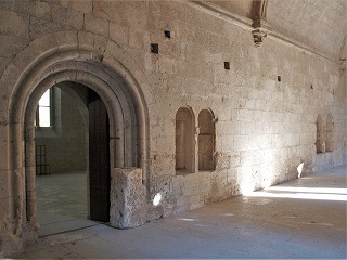 Dortoir 東ギャラリーの上階は全て、修道士達の寝室になっています。長さ33メートル、幅7メートルという大きさの寝室は、半円型の開口部から採光します。この尖頭型ヴォールトで覆われた広大なスペースで、修道士達は床に直接藁布団を敷いて寝ていました。 日中に利用された部屋の中央にある大きな階段は、回廊と繋がっています。南側にあるもう一つの階段は、夜の聖務日課のために教会堂に続きます。 西の扉は、回廊のテラスに、北に見える扉は夜間用の便所に繋がっていました。 Tout le premier étage de la galerie orientale est occupé par le dortoir. De 33 m de longueur sur 7 m de largeur, il est éclairé des baies en plein cintre. Dans cette vaste salle voûtée en berceau brisé sur des arcs-doubleaux, les moines dormaient sur de simples paillasses reposant directement sur le sol. Le grand escalier central de jour aboutit au cloître. Un autre escalier sud, conduit à l'église pour les offices de nuit. La porte occidentale permettait l'accès sur les terasses du cloître, et la porte nord, sur des latrines (necessarium), utilisées uniquement la nuit. |