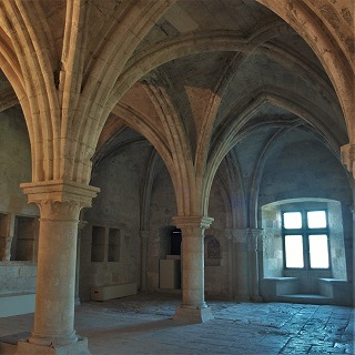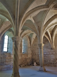 Chauffoir ou salle des moines 回廊の北東の角、面会室の隣に、13世紀前半に建てられた採暖室があります。唯一暖炉がある部屋で、写本の制作や針仕事、修練士の教育等が行われました。 採暖室はオジーヴ・ヴォールトで覆われ、ヴォールトのリブは、ウォーターリーフが彫刻された柱頭がある円柱へと繋がります。 |