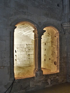 南側廊では、教会堂の創建者レ・ボーのベルトラン1世とその妻の地下納骨所があった場所を観察することができます。 Dans le bas-côté sud, est encore visible l'emplacement d'un caveau de Bertrand Ier des Baux, fondateur de l'abbatiale, et de son épouse Tiburge. |