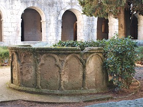 | 回廊の中庭には、手洗い場の受水盤が残ります。この受水盤は、小円柱からのぼる三葉と尖頭型の連続アーチで装飾されています。 修道士達はここで手を洗い、毎週の洗足の儀式、トンスラ(剃髪)、洗濯等の際にもここで水を汲みました。 |