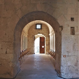 | La galerie orientale est la plus ancienne, à laquelle sont accolées plusieurs salles. L'ouverture à l'extrémité sud, est ornée des colonnettes à chapiteaux sculptés. |