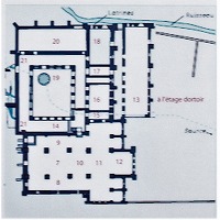 | 教会堂の北側に回廊が見えます。教会堂のファサードの前と南側には、一般信徒の墓地がありました。 修道院の囲い地の南に、ホテルリーがあります。今日修道院の入り口となっているこの建物には、医務室、病室、製パン室、修道院長の部屋がありました。教会堂の南西、教会堂とオテルリーの間には、貯蔵室がありました。現在一部が再建されています。 教会堂のファサードの手前にある、後世になってから造られた細長い貯水池の北側に、炊事場と、助修士達が利用する作業場等の建物があったようです。 一部の専門家は、修道院が造られた場所には、先行して11世紀に遡る隠修士の庵があったとしています。実際、近年回廊の西壁の傍に、修道院よりも古い建物の基礎が発見されました。 |
