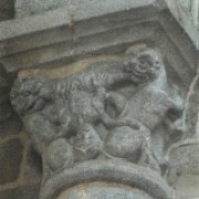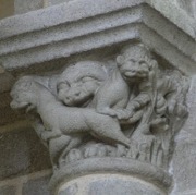 | A l'abside et au flanc nord de l'église, se trouvent de nombreux modillons pour la plupart en granite, représentant les masques humains, animaux et monstrueux. On retrouve les figures des hommes portant la moustache, ce qui serait la représentation rare en d'autre régions |