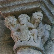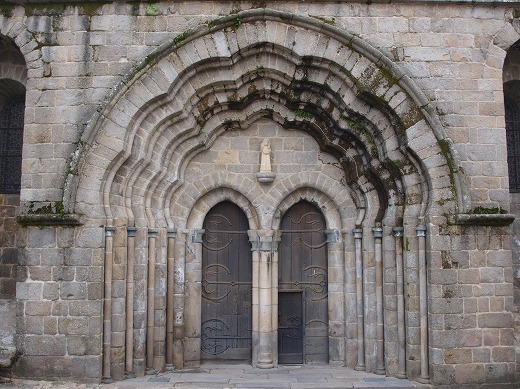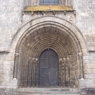 | 西ファサードの入り口はモザラベの影響を見せます。七葉が波打つ4つのヴシュールは、サーペンティンでつくられた柱頭がある小円柱に繋がっています。リムーザンでは、モザラベ・スタイルのヴシュールが採用されることは珍しいようです。 サーペンティンの柱頭がある3つの小円柱が束になった中央柱は、2つの扉の間にあります。扉のアーチは尖頭型ですが、二重アーチは半円型です。扉にはロマネスク時代のPenture(鉄製の装飾)が残ります。 |