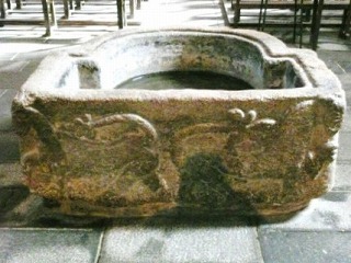 | Cuve baptismale 身廊西側に、カロリング朝時代に花崗岩で制作された大きな洗礼盤があります。この洗礼盤は、11世紀の教会堂にあったものです。 高さ0.68メートル、長さ1.67メートル、幅1.52メートル、深さは0.40メートルというサイズで、この洗礼盤は灌水ではなく、浸水(全身を水に浸す)による洗礼に使われていました。両角に、2頭の向かい合ったライオンが彫られていて、これらライオンの尻尾はパルメットになっています。 Au fond de la nef, on trouve une grande cuve baptismale carolingienne en granite. Elle provient de l'ancienne église du 11e siècle. De 0,68 m de hauteur, 1,67 m de longueur, 1,52 m de largeur, et 0,40m de profondeur, il servait au baptème par immersion. On y retrouve, à chaque angle, deux lions affrontés dont les queues se terminent en palmettes. |