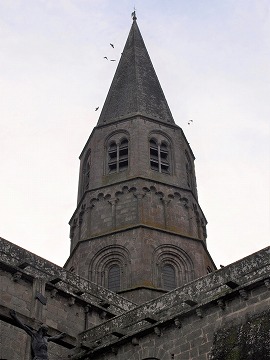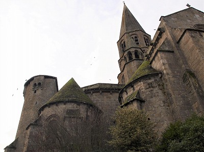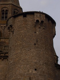 | 西ファサードの厳格な印象とは対照的に、後陣は絵画のような美しいシルエットです。 防衛塔はノートル・ダム塔とも呼ばれ、西側は平面になってており、中央の放射状祭室の上に聳えます。これは教会堂が15世紀に要塞化された時の名残です。ロマネスク期のモディヨンで装飾された3か所のブレテーシュ(石落とし)、銃眼等が観察されます。 |
