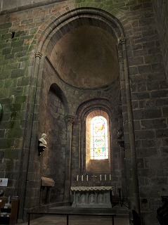 内陣は4つの円柱に繋がる交差ヴォールトで覆われ、これら円柱の柱頭は、ひとつだけ彫刻が施されています。また内陣は、2メートルもの厚さのある壁で周歩廊と隔てられています。 内陣には、花崗岩で制作されたロマネスク期の主祭壇があります。また1130-1659年の間には、イズラエルとテオバルドの聖遺骨がおさめられた石棺が置かれていました。(1130年、聖人らの遺骨は地中から掘り出され、クリプトに移送されました。) Le choeur est voûté d'arêtes retombant sur quatre colonnes à chapiteaux, dont un seul est sculpté, et séparé du déambulatoire par le mur de près de 2 m d'épaisseur. Il abrite un maître-autel roman en granite. De 1130 à 1659, se trouvaient deux sarcophages-reliquaires d'Israël et de Théobald : les reliques des saints ont été levées de terre, et transférés en procession dans la crypte. 周歩廊は尖頭型のヴォールト、3つの放射状祭室はセミ・ドームで覆われています。 中央の放射状祭室には、数々の彫像が展示されています。かなり傷んでいますが、13世紀の修道院長像、ピエタ等があります。 Le déambulatoire est voûtés en berceau légèrement brisé, tandis que trois chapelles rayonnantes sont couvertes en cul-de-four. Dans la chapelle axiale, se trouvent des statues très mutilées : un abbé mitré du 13e siècle, une piéta, un saint Pierre sur son trône, etc.. |