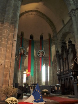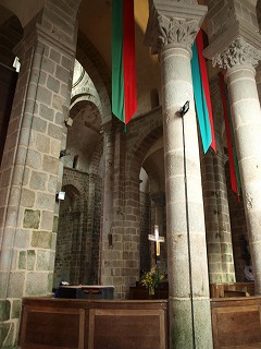 Choeur トランセプトより4段高くなった内陣は、2ベイで構成され、柱頭彫刻がある円柱に繋がる半円型のアーケードで縁取られています。最初のベイは尖頭型のヴォールトで覆われ、続くベイ又はアプスは半円プランで、セミ・ドームに覆われています。 内陣は3つの放射状祭室が面した周歩廊に囲まれています。 Le choeur surélevé de quatre marches au dessus du transept, se compose de deux travées, encadrées de l'arcade en plein cintre, qui tombe sur les colonnes à chapiteaux sculptés. La première travée droite, est voûtée en berceau brisé, alors que la travée prolongée ou l'abside hémicirculaire est couverte en cul-de-four. Le choeur est entouré d'un déambulatoire à trois chapelles rayonnantes. |