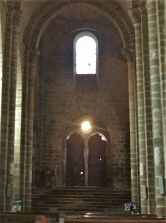 | Plan 教会堂はラテン十字のプランで、5ベイの3身廊、後陣祭室がある張り出したトランセプト、3つの放射状祭室がひらかれた周歩廊に囲まれた2ベイの内陣で構成されます。 教会堂の縦軸は南に向かってやや曲がっています。 La collégiale en croix latine, est constituée de trois vaisseaux de cinq travées, d'un transept saillant donnant sur les absidioles, et d'un choeur de deux travées, entourées du déambulatoire à trois chapelles rayonnantes. L'axe de l'église dévie légèrement vers le sud. 教会堂の東部分は、1110−1130年の間に東から西に向かって建てられました。次に西側は1130年より後に、西ファサードから東に向かって建設されました。そして最後に、身廊の4番目(又は5番目のベイも)を造りながら、2つの部分が繋げられたようです。 La partie orientale a été établie de l'est vers 1110-1130. Puis, la partie occidentale a été bâtie de la façade en est après 1130. Enfin deux partie auraient été liées en intercalant la 4e travée (ou aussi la 5e travée) de la nef. Nef 高さ17メートルある身廊は、5ベイからなります。前室なっているクーポルで覆われた最初のベイを除き、他の4つのベイは尖頭型のヴォールトで覆われています。5番目のベイは、参事会員の内陣とされ、聖職者席が設置されていました。 De 18 m de hauteur environ, la nef est composée de cinq travées, voûtées en berceau légèrement brisé sur doubleaux, sauf l'avant-nef de la première travée couverte d'une coupole. La dernière travée a été déstinée du choeur des chanoines avec ses stalles. |