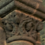 | トランセプトは大きく張り出しています。北翼廊には、大きな半円型のリムーザン風の窓の下に入り口があり、手前のポーチは尖頭型のヴォールトで覆われています。 | 北翼廊に、サン・ジャンの入り口があります。尖頭型のアーキヴォールトは、リムーザン風の3層のヴシュールで装飾されていて、このヴシュールに繋がる柱頭は、今日すっかり傷んでしまっています。 | |