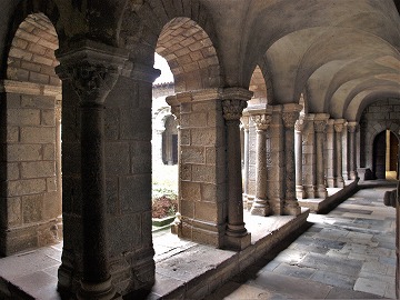 | Accolée aux trois derniers travées des bas-côtés nord de la cathédrale, la galerie sud la plus ancienne, remonte au 11e siècle. Mais elle est la plus remaniée par les restaurations du 19e siècle. Du côté nord de la galerie nord, se trouvait la tour Saint-Mayol du 12e siècle, abbattue dans les années 1840. |