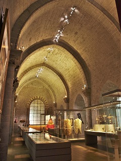 西ギャラリーは、13世紀初めに完成したマシクーリと呼ばれる建物に面していてます。このマシクーリを備えた建物は5層で、大聖堂の北側廊に隣接しています。 La galerie occidentale donne sur le bâtiment des mâchicoulis, achevés au début du 13e siècle. Pourvu de mâchicoulis, ce bâtiment à cinq étages, est attenant au bas-côté nord de la cathédrale. この建物の地上階はシャペル・デ・ルリクで、この尖頭型のヴォールトで覆われたスペースは、かつては参事会の図書室でした。この部屋には、15世紀末に制作されたリベラル・アーツ(文法・修辞・論理・算術・幾何・天文・音楽の自由七学科)を表現したフレスコ画が残ります。 その上の階はエタ・デュ・ヴレイというゴシックのスペースで、1895年より展示スペースとして利用されています。 Ce bâtiment contient au rez-de-chaussée, la chapelle des reliques ou chapelle d'hiver, voûtée en berceau brisé sur doubleaux, qui accueillait la bibliothèque du chapitre. Cette chapelle conserve la célèbre fresque des arts libéraux réalisée à la fin du 15e siècle, découverte en 1850. La salle gothique des Etats du Velay à l'étage supérieur, accueille le musée d'art religieux depuis 1895. これら2つのスペースでは、大聖堂の見事な宝物の数々が展示されています。 Ces deux salles exposent une collection des trésors de la cathédrale. |