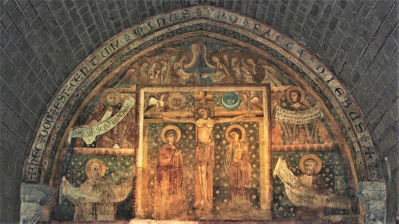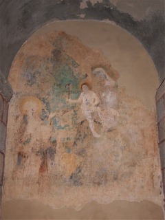 | 南の壁に、12世紀末又は13世紀に制作された、キリストの磔刑を表現したフレスコ画が見られます。このフレスコ画もまた、人物の顔、衣服等にビザンティンの影響を残しています。このフレスコ画は19世紀にモルタルの下から発見されました。 | ||