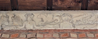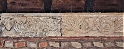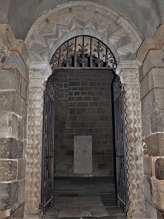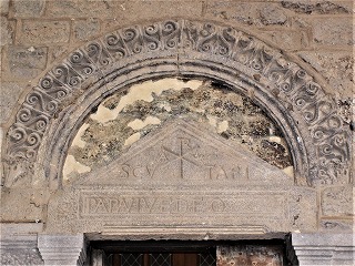 | この扉には、1847年に実施された発掘調査の際に発見された、山型のリンテルが設置されています。このリンテルには「Scrutari papa Vive Deo」と銘が刻まれていて、クリスム(キリストをあらわすモノグラム)が刻まれています。これは、5世紀に遡る最初の教会堂の建設者である、ル・ピュイ司教Scutaireの墓碑で、ガロ・ロマン時代の墓碑を再利用して造られたものです。Papaという言葉は、恐らく扉に与えられた名にあわせるために、後から付け足されました。 タンパンを囲むSの文字が並んだフリーズはケルトのもので、ローマ時代の遺構の層にある教会堂の基礎の中で発見されたようです。 |
