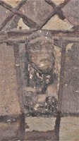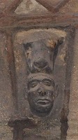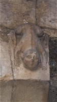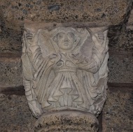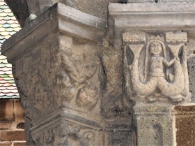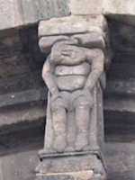 このポーチは東と南に大きなアーチで開かれています。 ロマネスクのポーチは、オジーヴ・ヴォールトで覆われています。ヴォールトの頂は、翼の生えたドラゴンで装飾されています。 Le porche est ouvert par des grands arcs à l'est et au sud. Le porche roman, est couvert de la voûte d'ogives, dont le clef est orné d'un dragon aillé. このアーチの上に更に大きなアーチがあり、このアーチとアーキヴォールトは、3つのパーツで繋がっています。このうち中央のパーツには、アトランタが彫刻されています。 Ces arcs en plein cintre sont surmontées d'un grand arc détaché, qui relie à l'archivolte par trois éléments de pierres, dont celui central représente un atlante. |