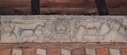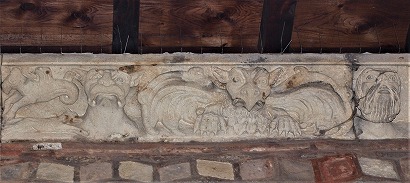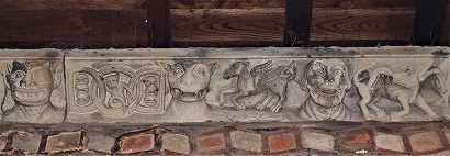 | 後陣の裏に、奇跡を起こすとされる井戸がある、小さな中庭があります。この中庭から後陣の壁を観察することができます。 後陣の基壇に、ガロ・ロマン時代に遡る、狩猟と動物同士の闘いを描いた、4つのレリーフが埋め込まれています。これらはローマ時代の神殿にあったフリーズを再利用したものです。 またこれらのレリーフの上に、井戸とその水源に関するラテン語の銘が残っています。 |