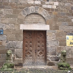 | Le tympan du portail roman, représente le Christ en majesté entre deux anges, tandis que le linteau figure la Cène. Ces sculptures ont été rasées lors de la Révolution. |