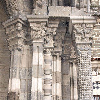 | オーヴェルニュ・ロマネスクのスタイルのファサードは、複数色の火山岩が幾何学的に配されていることを特徴とします。アーチでは、明暗の石が交互に組まれています。ピニョンでは、折り重なった菱形を形成する網目積み(オプス・レティクラトゥム)、魚の骨のような形を見せるジグザグ積み(オプス・スピカトゥム)による、モザイクのような装飾が見られます。 このような複数色の石を幾何学的に積んで作られる装飾の起源は、モザラベ建築、或いは十字軍兵士が影響を受けた東方世界にあるとされます。 |