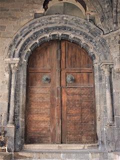 | Porche occidental ル・ピュイの大聖堂は独特な建築構造で、西ポーチは身廊の下に位置します。この構造は、地面の傾斜に起因します。 西ポーチは、4ベイで構成されます。はじめの2ベイは12世紀末に造られましたが、14世紀にオジーヴ・ヴォールトで覆われ、側廊があります。3番目のベイは、中央身廊のみで、その脇は木製の扉が設置された祭室になっています。 Notre-Dame du Puy montre l'architecture particulière : le grand porche occidental est situé sous la nef : cette disposition s'explique par la déclivité du terrain. Le porche occidental se constitue de quatre travées. Edifiées à la fin du 12e siècle, deux premières, sont couvertes de la voûtes d'ogives, réalisée au 14e siècle, et flanquées des bas-côtés. A la troisième travée, les bas-côtés sont remplacés par les chapelles avec des portes en bois. 階段はポーチの中でものび(32段)、最後のベイにある1150-1175年の間に整備されたPorte doréeに行き着きます。この扉には、ロマネスク時代の鉄製の装飾が開き戸に残ります。 Le grand escalier se continue dans le porche (32 marches), et aboutit à la porte dorée dans la dernière travée, aménagée entre 1150 et 1175, dont les vantaux conservent des fragments de ferrures romanes. 階段はここで2股に分かれます。北の階段は、回廊の西ギャラリーに繋がります。1850年に整備された南の階段は、南側廊にある現在の教会堂の入り口へと通じます。 |