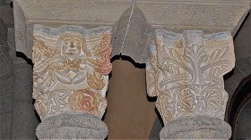 | 円柱の柱頭彫刻は、制作時期は異なり、質も異なります。大半の柱頭は植物モティーフで、14の柱頭に聖人伝が刻まれています。 四福音記者のシンボル、神の子羊、聖杯から水を飲む鳩、といった伝統的なモティーフも見られますが、この他、権力の象徴である司教杖を巡って修道院長と女修道院長が争っている場面を描いた柱頭、また、色欲を象徴する、王笏を手にした雌のケンタウロスが、雄のケンタウロスから逃げるというシーンを描いた柱頭もあります。これらは西ギャラリーで見ることができます。 回廊の中庭側に設置されている大半の柱頭が、19世紀に修復されています。 また、南東の角にある柱頭には、彩色された痕跡が残り、このことから中世回廊は色塗られていたことが伺えます。 |