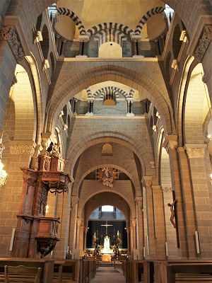 | 19世紀、大修復工事が行われました。唯一3・4番目のベイがオリジナルの姿を残すのみで、その他の部分はほぼ完全に再建されています。 Une grande restauration a été entreprise au 19e siècle : seules la troisième et la quatrième travées sont dans leur état d'origine. Le reste de l'église a été presque entièrement reconstruite. 身廊と側廊の間には、尖頭型の大アーケードが並びます。アーケードの上には3つ連続したアーチがあり、更にその上に半円型の開口部がひとつあります。 身廊の各ベイを隔てるアーチは、東側では半円型で、西側では尖頭型になっています。 5・6番目のベイでは、ピラーは十字型になっています。 Les grandes arcades en arc brisé séparent la nef des bas-côtés. Elles sont surmontées de trois arcatures. Au-dessus, est percée une baie en plein cintre. Les grands arcs séparent les travées de la nef, sont en plein cintre à l'est, mais en arc brisé à l'ouest. Dans les deux travées occidentales, les piliers sont cruciformes. |