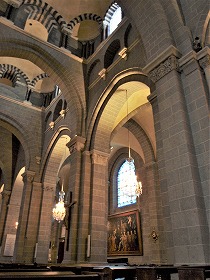 6ベイからなる身廊は、トロンプ技法による八角形のクーポルで覆われています。この天井で一列に連なったクーポルから、ル・ピュイの大聖堂がビザンティン建築から多大に影響を受けていることがみてとれます。 クーポルは8つの連続したアーチで装飾され、これらの複数色の石で組まれたアーチは、柱頭彫刻がある小円柱に繋がっています。 La nef de six travées est couverte des coupoles octogonales sur trompes. Par ces coupoles en enfilade, la cathédrale du Puy est fortement influencée par l'architecture byzantine. Les coupoles sont ornées de huit arcatures faites des claveaux polychromes, reposant sur les colonnettes à chapiteaux sculptés. |