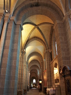| Plan 大聖堂はラテン十字のプランで、6ベイの三身廊、各翼廊に2つずつ後陣祭室があるトランセプト、内陣、その両脇の後陣祭室で構成されます。大半の巡礼教会堂とは対照的に、内陣を取り囲む周歩廊はありません。 En forme de la croix latine, la cathédrale se constitue de trois nefs de six travées, d'un transept saillant, dont chaque croisillon se termine par deux absidioles jumelées, et d'un choeur flanqué de deux absidioles. Contrairement à la plupart des églises de pèlerinage, elle est dépourvue de déambulatoire encadrant le choeur. Nef 最初の教会堂は、2ベイの単身廊でした。そこに6世紀、側廊が造り足されました。 9世紀、3番目のベイが造り足されました。次に11世紀に、トランセプトと4番目のベイが追加され、12世紀後半に西ポーチと共に、5・6番目のベイが完成しました。 L'église primitive se composait d'une seule nef de deux travées. Au 6e siècle les bas-côtés ont été ajoutés. Au 9e siècle, une troisième travée s'est ajoutée, puis, dans le courant du 11e siècle, un transept et une quatrième travée ont été construits, et enfin, dans la seconde moitié du 12e siècle, l'église s'est enrichie de deux dernières travées, ainsi que le porcheoccidental. |