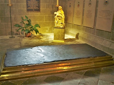 現在、シャペル・デュ・サン・クリュシフィクス(内陣の北側にある後陣祭室)に、有名な熱病の石があります。これは玄武岩でできた石板の一部で、長さ3メートル、幅2メートルというサイズです。 Aujourd'hui, se trouve la pierre des Fièvres dans la chapelle du Saint-Crucifix (absidiole du côté nord du choeur). C'est une table basaltique une partie conservée, mesurant de 3 m longueur sur 2 m de largeur. この石板は、数千年来この場所にあったドルメンの一部で、かつては内陣の近くに置かれていました。11世紀頃ドルメンのテーブル部分は四角く平らに形を整えられ、南側廊の床に埋め込まれました。18世紀になると、ファサードの大階段の最も高い位置にある踊り場、当時のメインの入り口付近に移されました。 Il s'agit d'une partie d'un dolmen, qui occupait depuis plusieurs millénaire l'emplacement actuel de la cathédrale. Dans les premiers temps, le dolmen s'est élevé près du choeur. Vers le début du 11e siècle, équarrie et aplanie, la pierre a été insérée dans le pavement du bas-côté sud. Puis, au 18e siècle, elle a été déplacée au plus haut palier de l'escalier de la façade, l'ancienne entrée principale. |
