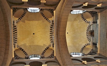 | Voûtées d'arêtes, les galeries comportent cinq arcades au nord et au sud, neuf à l'ouest et dix à l'est. Les arcades en plein cintre à double rouleau, reposent sur des piliers carrés, flanqués de colonnettes monolithes à chapiteaux sculptés à quatre côtés. Les colonnettes sur les faces latérales supportent un deuxième arc s'insérant sous les arcades, tandis que celles de l'intérieur servent d'appui aux voûtes des galeries. 半円型のアーケードは、交互に複数色の石で組まれています。アーケードの上に、赤、オークル、白、黒色の石が菱形に配された、モザイクのような装飾が見えます。 Les arcades ont des claveaux polychromes s'alternant. Elles sont surmontées du décor des pierres rouges, ocres, blancs ou noirs, disposées en losanges, comme une mosaïque. |