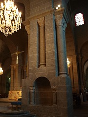 Croisée du transept 交差部のクーポルは19世紀、オリジナルとは異なる形に再建されています。 今日交差部は、四面に円柱を備えた大きな長方形の柱に囲まれています。この柱の土台は巨大で、高さ2メートルもあります。 交差部の上には、ドームで覆われた八角形の塔が聳えます。2層からなるランタン型のこの塔は、天使の鐘楼とも呼ばれます。 La coupole de croisée a été modifiée au 19e siècle. Aujourd'hui, la croisée du transept est encadrée de quatre gros piliers rectangulaires à colonnes engagées, qui s'élèvent sur un énorme socle de 2 m de hauteur. Elle est surmontée d'une tour octogonale coiffée d'un dôme. Cette tour lanterne de deux étages, est appelée le clocher angélique. |